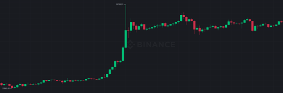 - On the bottom of the chart, the grey areas represent BTC's trading volume.