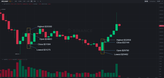 The graph above is the daily candlestick chart for BTC/USDT in Binance. What does each of these red and green candlesticks represent?